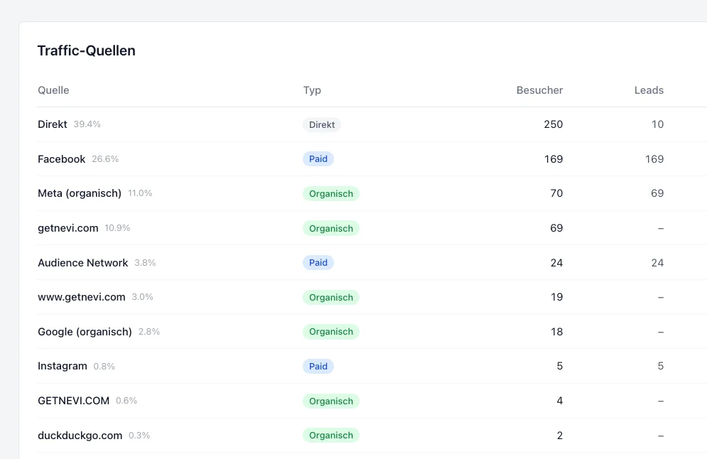 - Direkt, organisch oder bezahlt — alles auf einen Blick